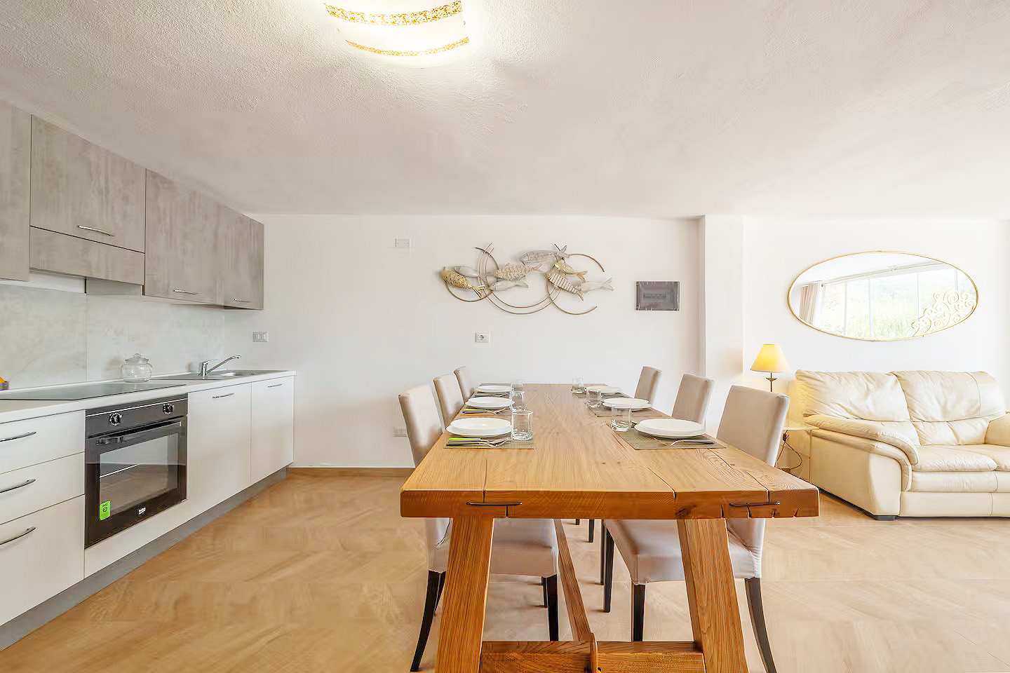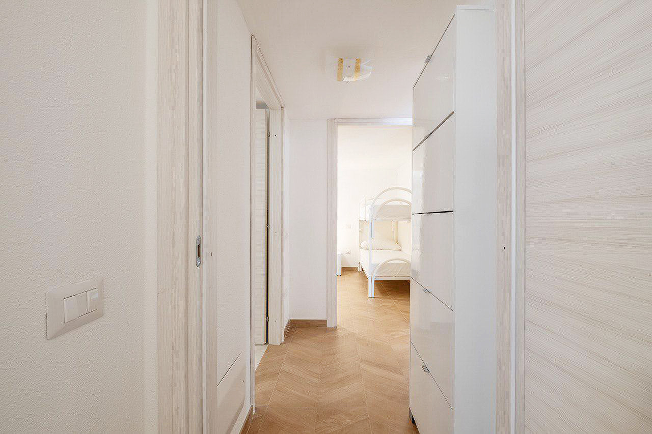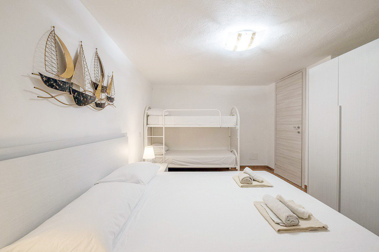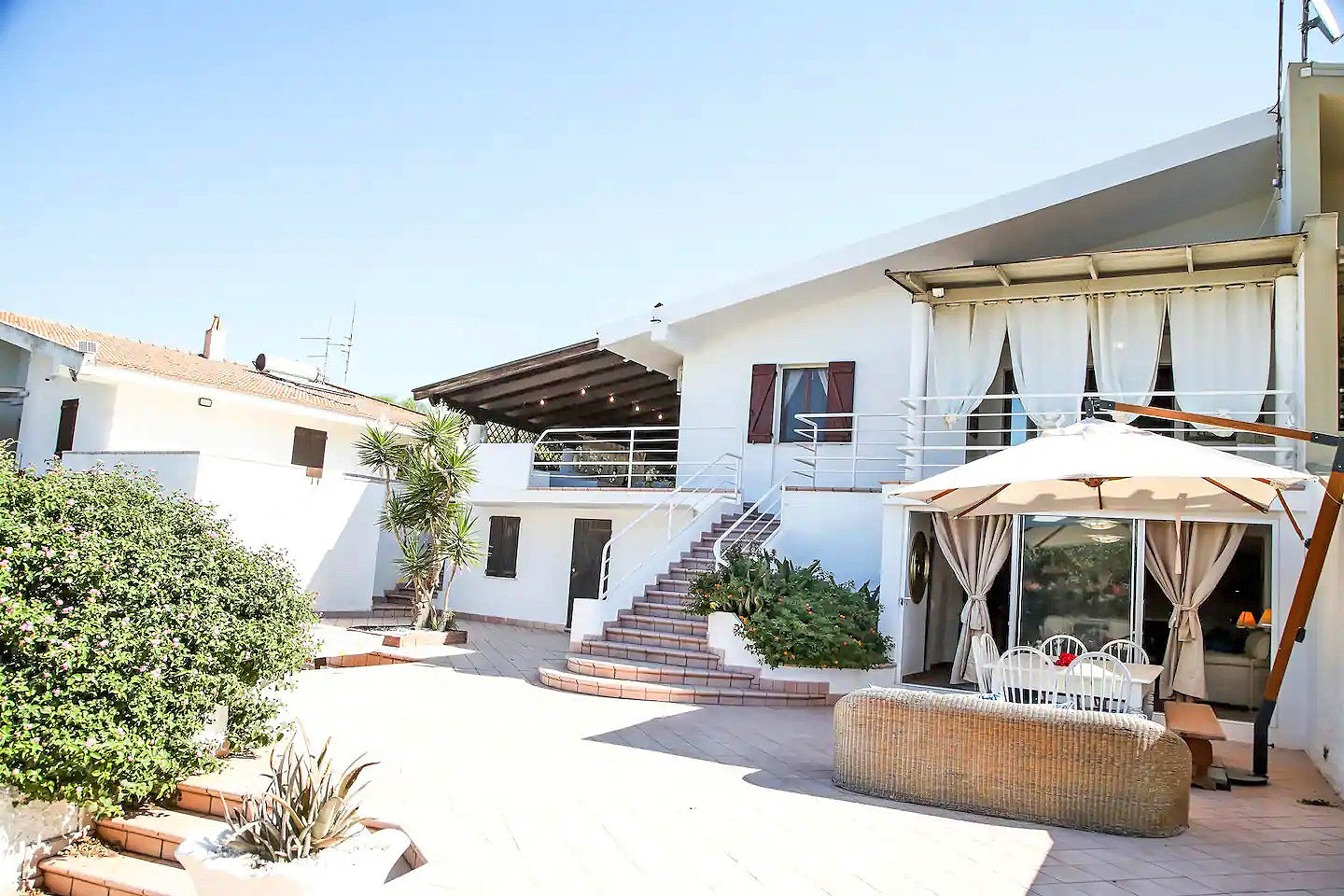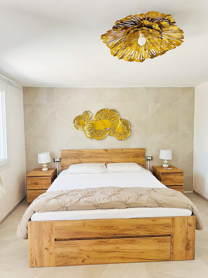 Mit einer Gesamtwohnfläche der beiden Appartements von ca. 220 Quadratmetern, verteilt auf zwei Ebenen, stehen den Gästen zur Verfügung: zwei große Wohn-/Essbereiche mit integrierten Küchen, fünf Doppelzimmer, drei Dreibettzimmer, drei Bäder mit Dusche/WC/Bidet und ein Bad mit WC/Bidet ohne Dusche, ein großer überdachter, möblierter Balkon mit Meerblick, eine möblierte Terrasse mit Gartenmöbeln und Grillmöglichkeiten sowie ein eingezäunter Gartenbereich mit privatem Pool.