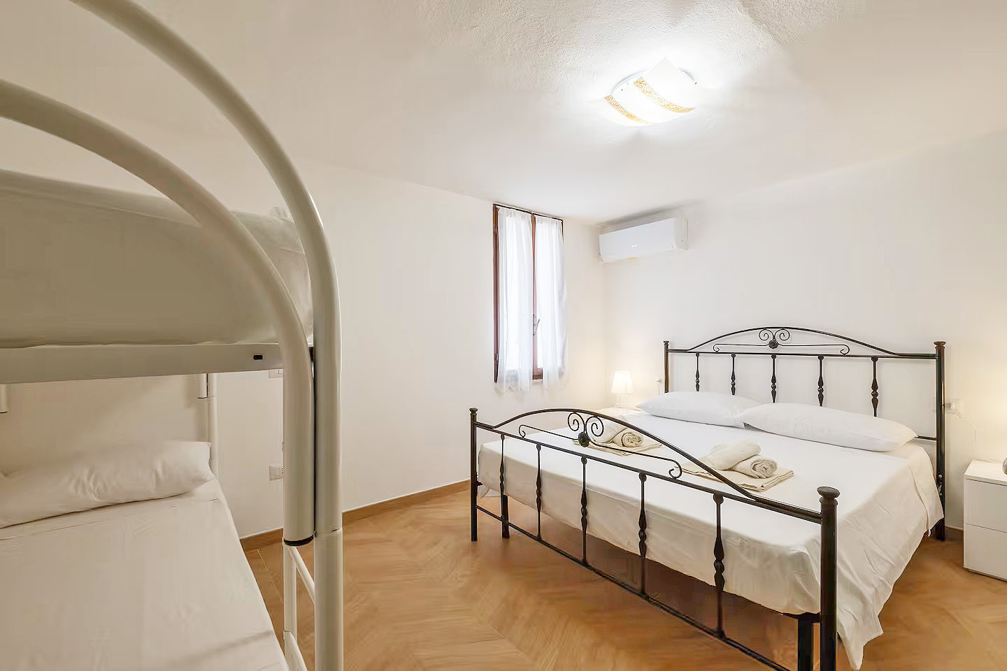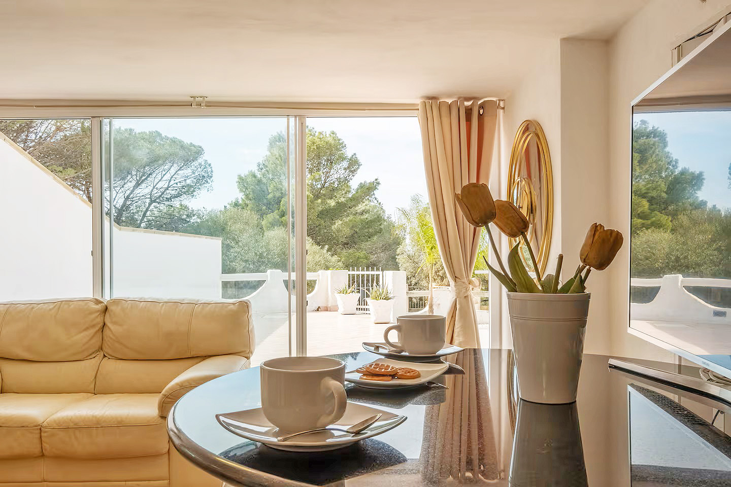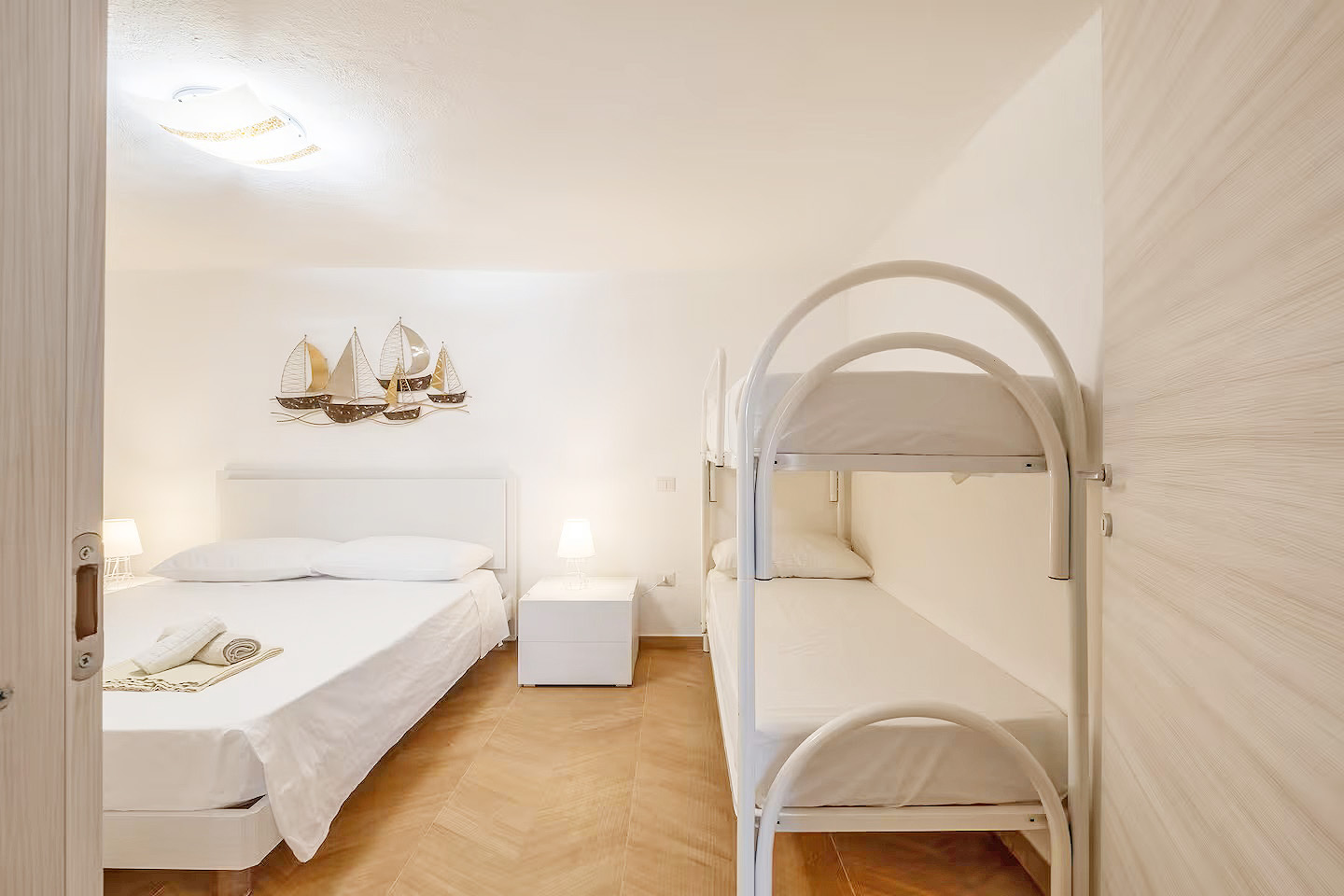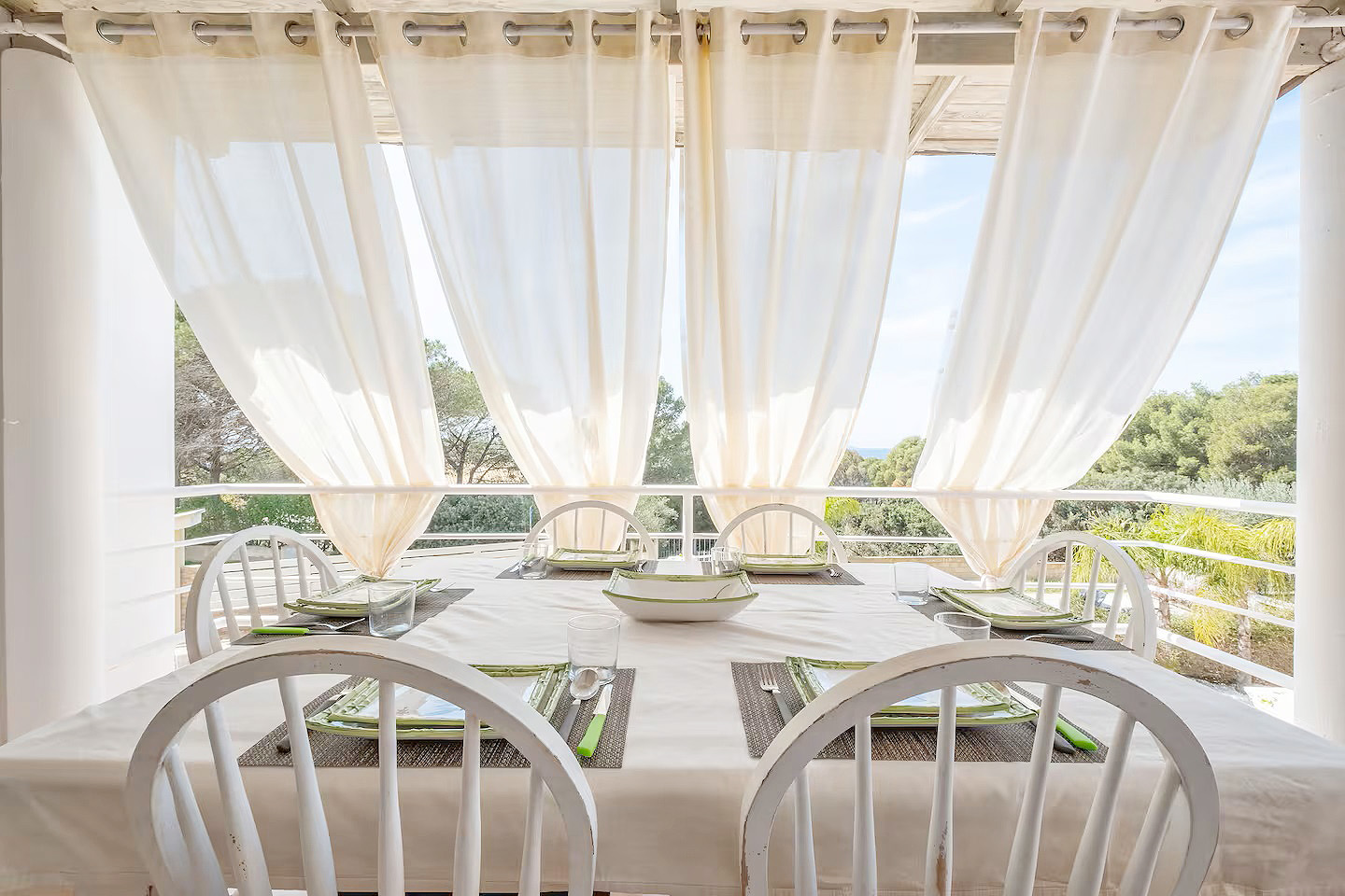 Mit einer Gesamtwohnfläche der beiden Appartements von ca. 220 Quadratmetern, verteilt auf zwei Ebenen, stehen den Gästen zur Verfügung: zwei große Wohn-/Essbereiche mit integrierten Küchen, fünf Doppelzimmer, drei Dreibettzimmer, drei Bäder mit Dusche/WC/Bidet und ein Bad mit WC/Bidet ohne Dusche, ein großer überdachter, möblierter Balkon mit Meerblick, eine möblierte Terrasse mit Gartenmöbeln und Grillmöglichkeiten sowie ein eingezäunter Gartenbereich mit privatem Pool.