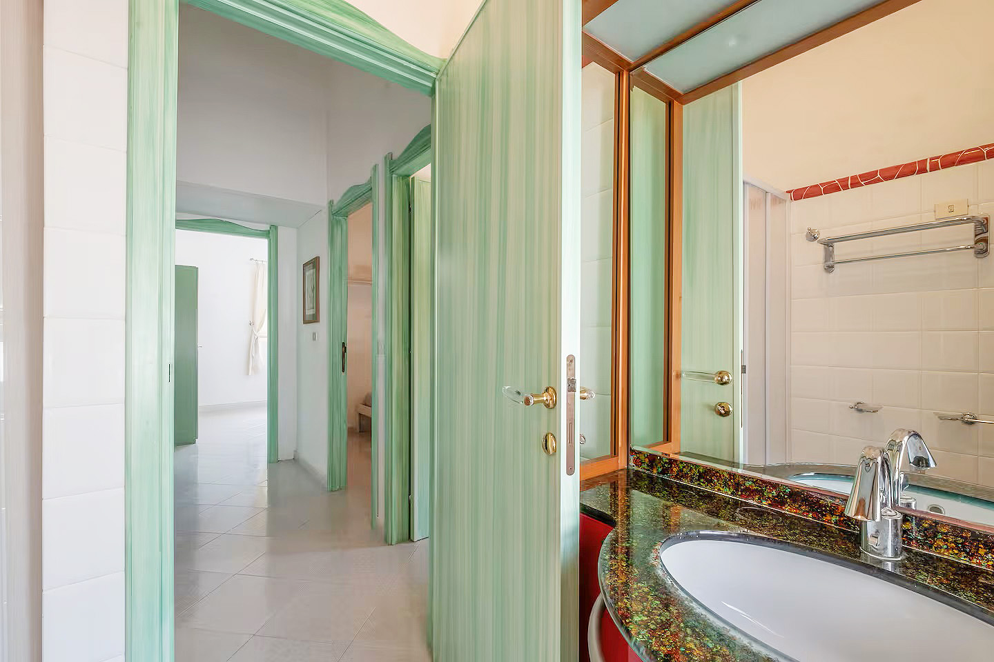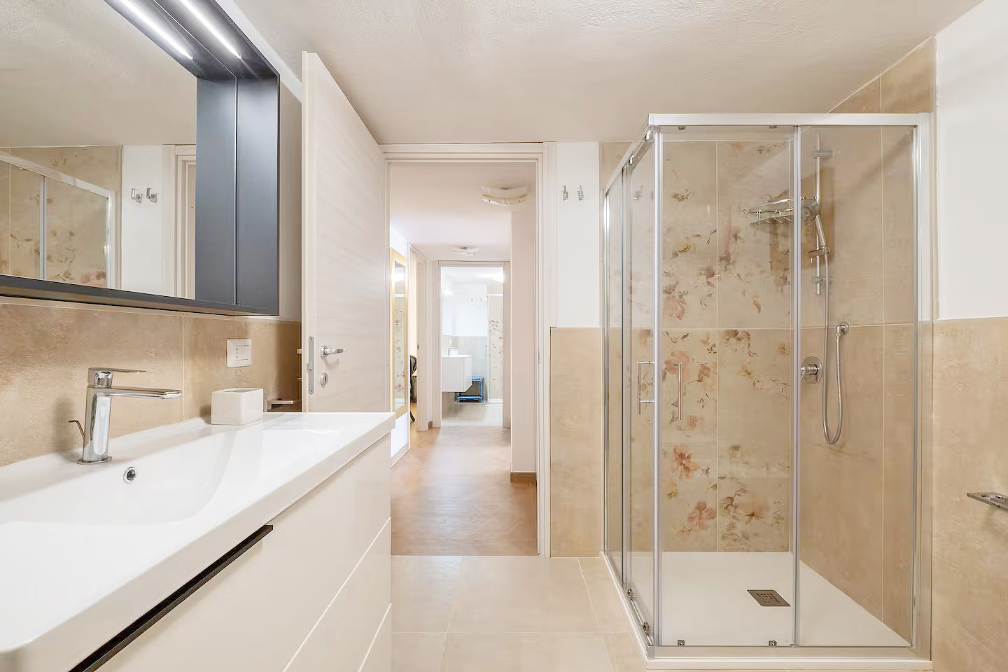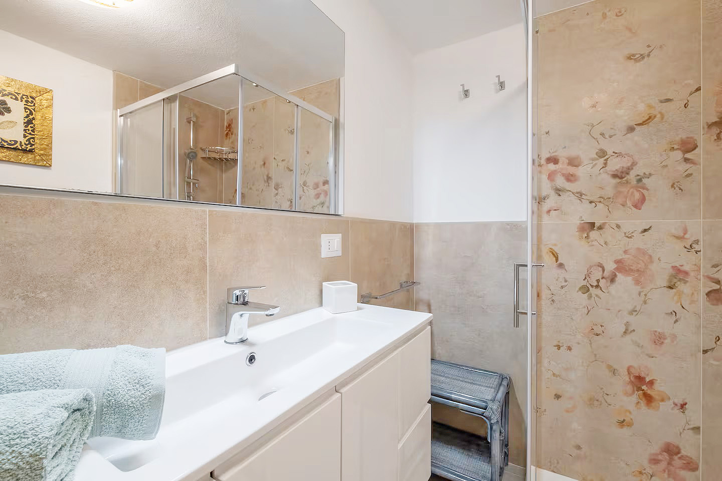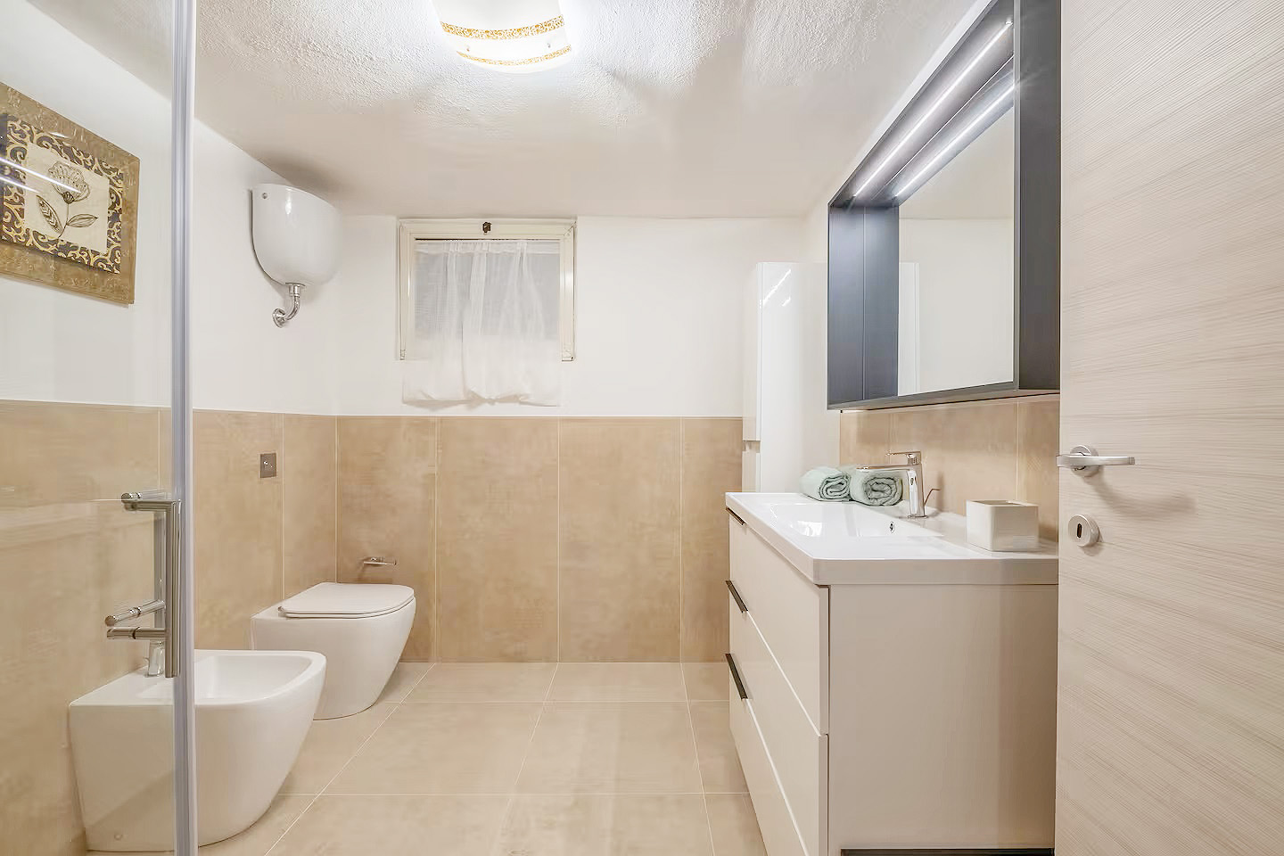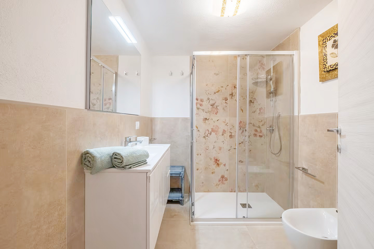 Mit einer Gesamtwohnfläche der beiden Appartements von ca. 220 Quadratmetern, verteilt auf zwei Ebenen, stehen den Gästen zur Verfügung: zwei große Wohn-/Essbereiche mit integrierten Küchen, fünf Doppelzimmer, drei Dreibettzimmer, drei Bäder mit Dusche/WC/Bidet und ein Bad mit WC/Bidet ohne Dusche, ein großer überdachter, möblierter Balkon mit Meerblick, eine möblierte Terrasse mit Gartenmöbeln und Grillmöglichkeiten sowie ein eingezäunter Gartenbereich mit privatem Pool.